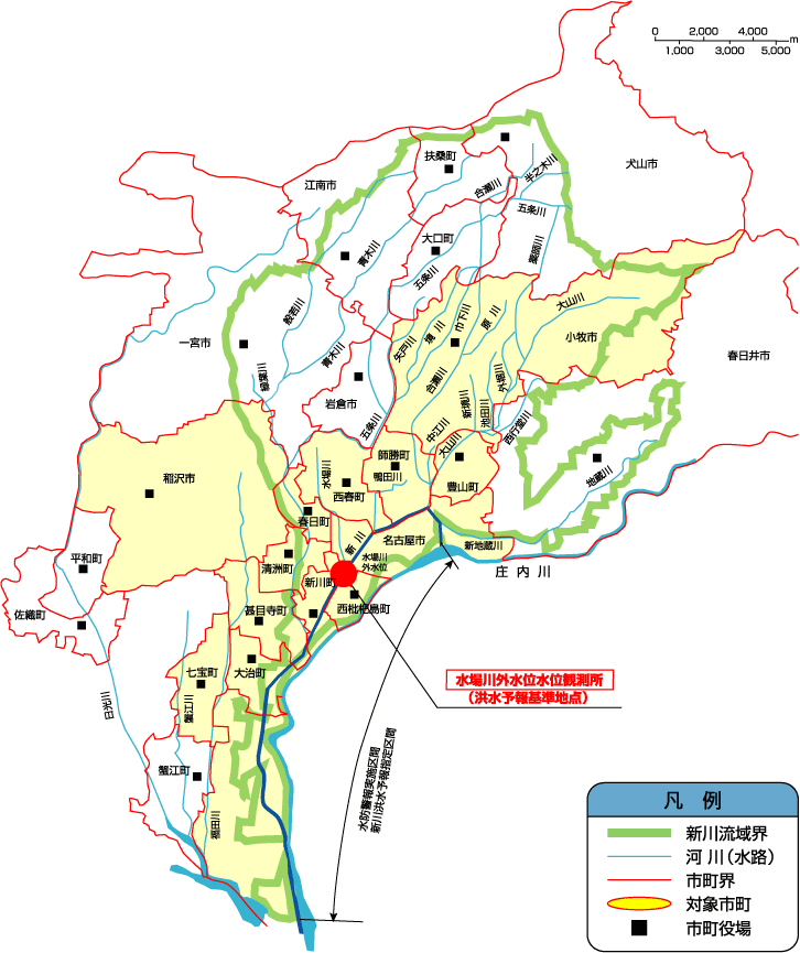 新川洪水予報の指定区間と対象市町