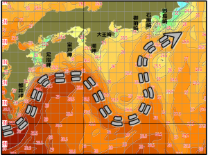 人工衛星からの情報を利用し、クロロフィルa濃度の分布や海面水温の解析を行っています。