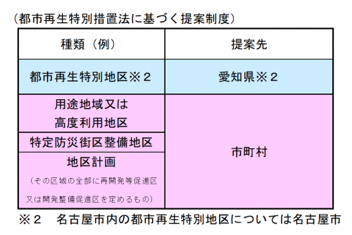 また、都市再生特別措置法に基づく都市計画提案制度とは、都市再生緊急整備地域内において民間等による都市再生の推進を図るため、都市再生特別措置法第37条の規定に基づいて、民間事業者等が一定の要件を満たした場合に、愛知県や市町村に対して、都市計画の決定又は変更を提案できる制度です。