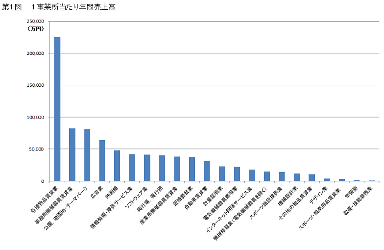 (3)年間売上高を、1事業所当たり及び従業者1人当たりで多い順にグラフ化すると、第1図及び第2図のようになります。