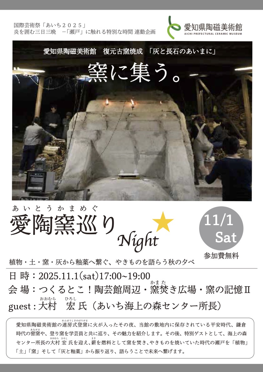 時代の窖窯や、登り窯を学芸員と共に巡り、その魅力を紹介します。その後、特別ゲストとして、あいち海上の森センター所長の大村 宏 氏を迎え、薪を燃料として窯を焚き、やきものを焼いていた時代の瀬戸を「植物」